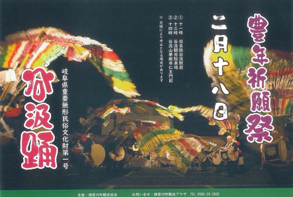 豊年祈願祭では、谷汲踊が奉納されます。谷汲踊は、源平合戦の勝利を祝って、源氏が踊った武者踊りがはじまりと伝えられています。