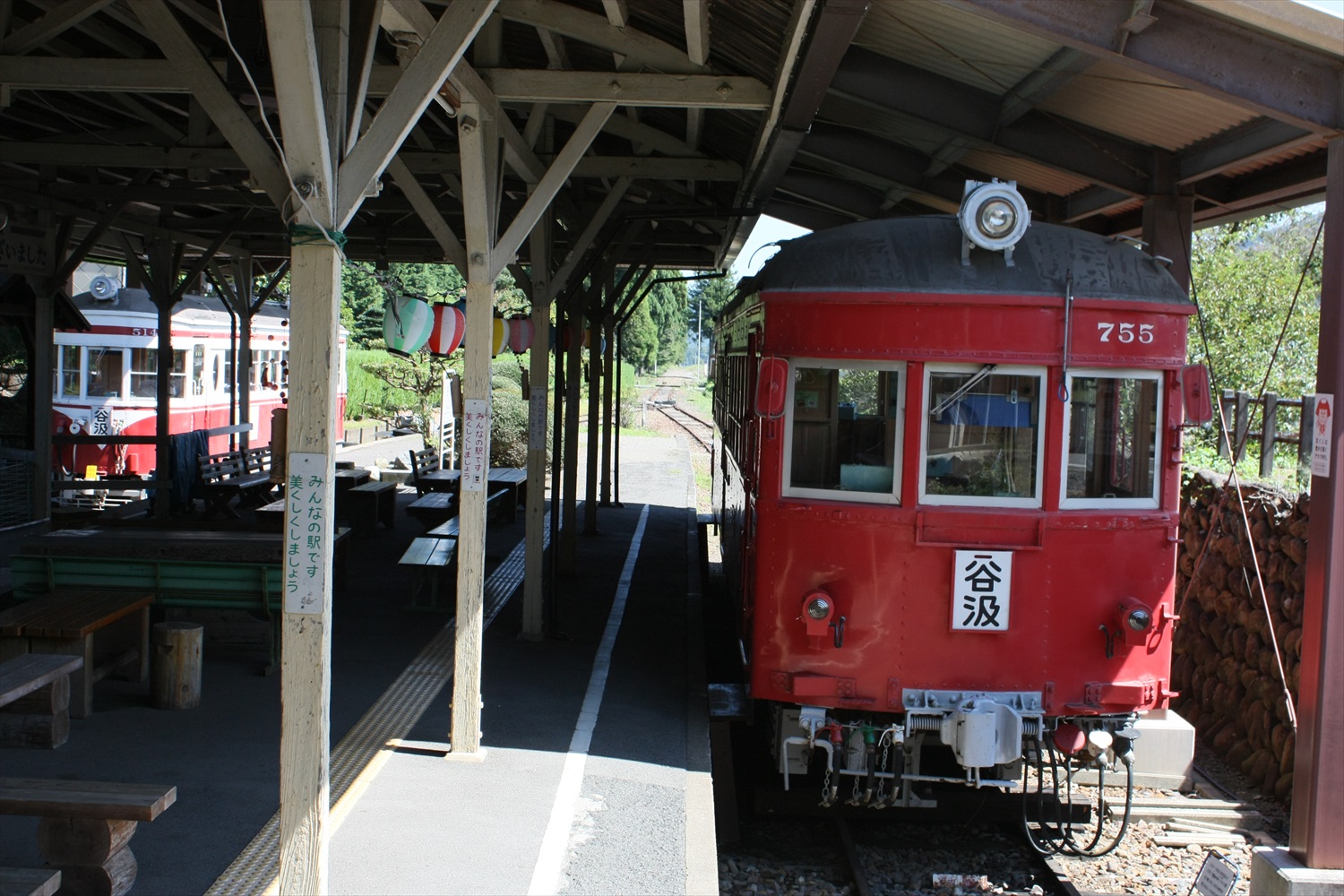 廃止後も駅舎は昆虫館とともに残され、構内にはモ750形755号車、モ510形514号車が静態保存されています。